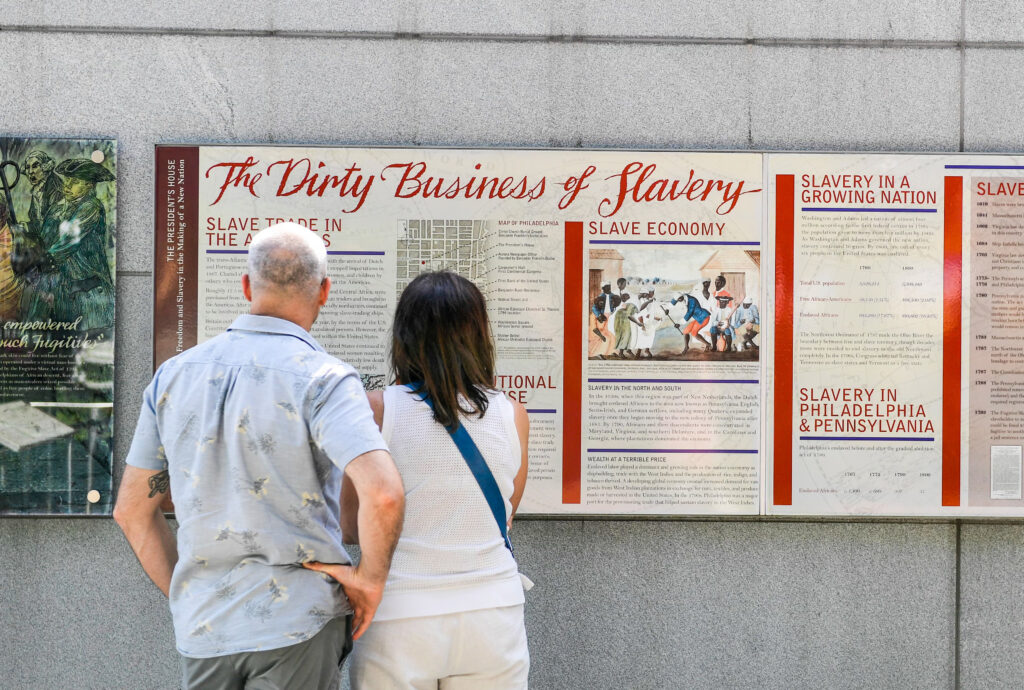 Tourists inspect a display entitled ‘The Dirty Business of Slavery’ at the President’s House in Philadelphia, Pennsylvania. The Trump administration has ordered the removal of all sites like this that talks about the slave trade era. Image Credit: Guardian