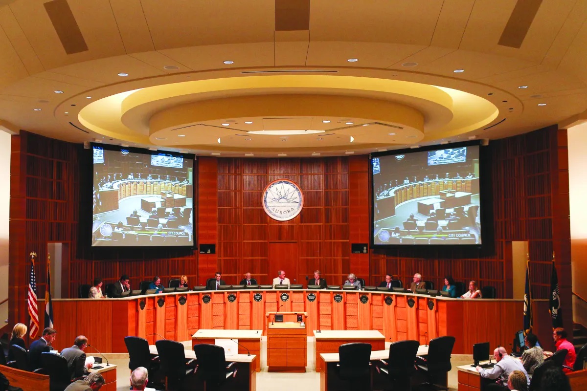 Aurora City Council members look on from behind the dais during public comment at a council meeting at the Aurora Municipal Center. Credit- Colorado Sun