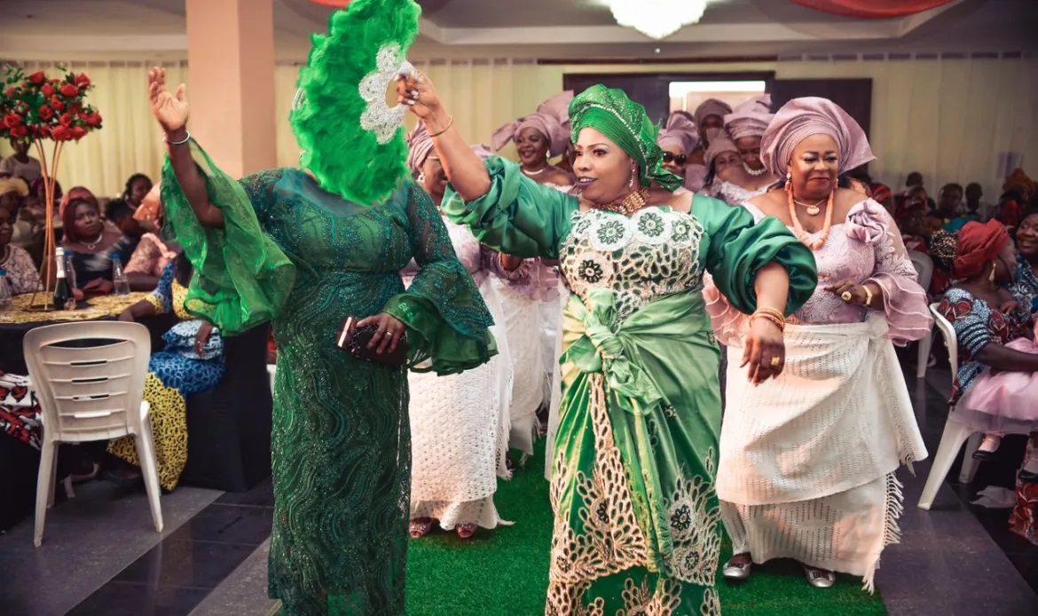 Nigerians love to dance and sing along to various genres of music such as Afrobeat, Highlife, Fuji, Juju, and Gospel. Some of the famous Nigerian musicians who are popular at parties are Flavour, Wizkid, Davido, Burna Boy, Tiwa Savage, Yemi Alade, and Sinach. The music at Nigerian parties are usually loud; the dancing is non-stop and the entire scene is illuminated by shimmering headpieces (gele) and colorful uniformed group attire (aso ebi).