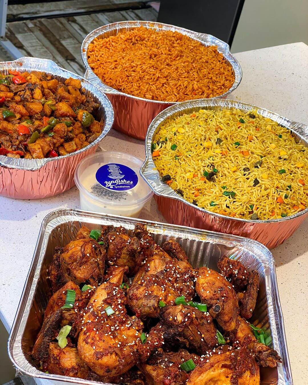 Some of the typical foods and drinks served at Nigerian parties are jollof rice, fried rice, ofada rice, pounded yam, egusi soup, pepper soup, moi-moi, suya, chin chin, palm wine, and beer.